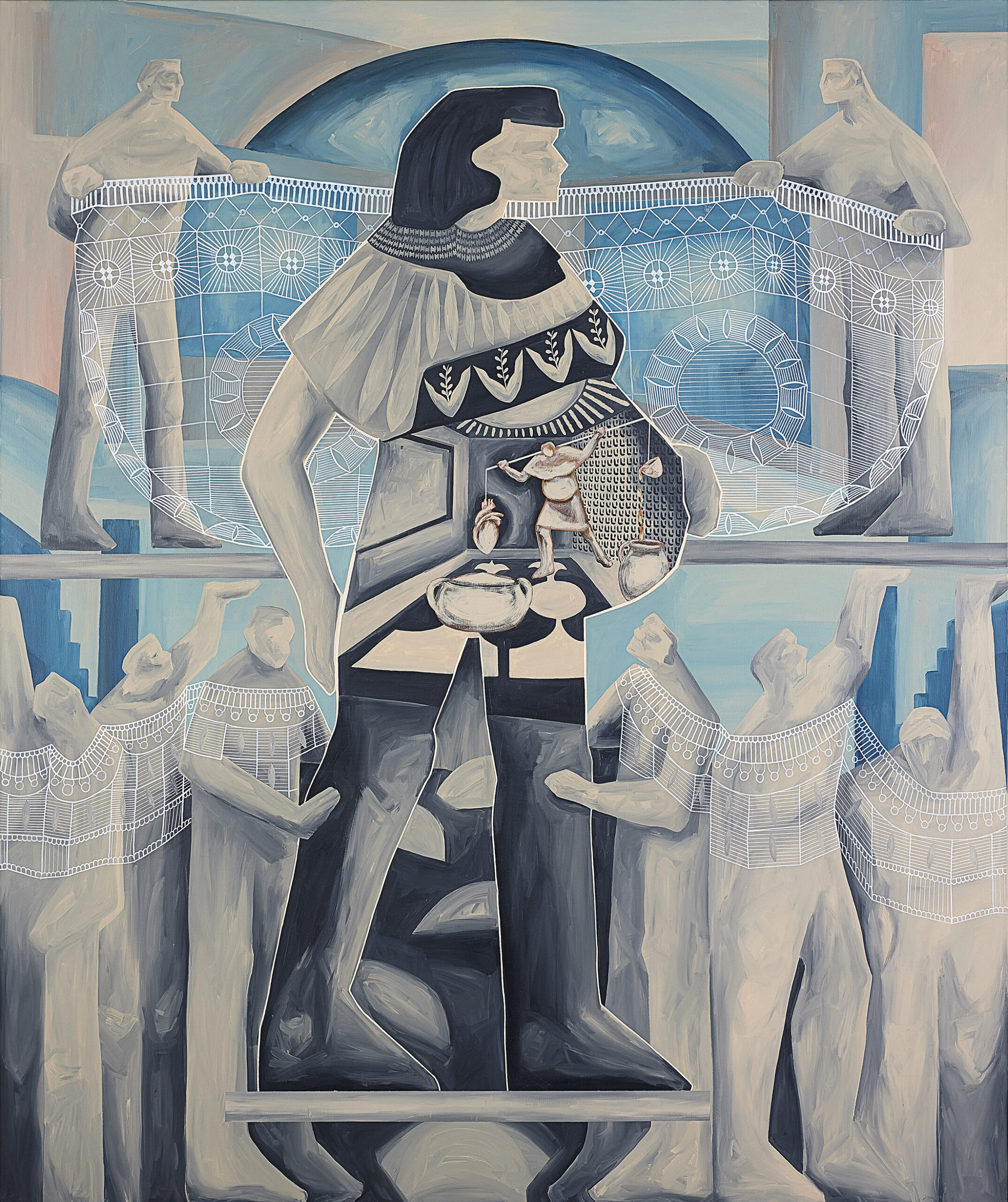 Sergide antik dönem estetiği, mitolojik göndermeler ve geleneksel motifler, tarihsel süreklilik ile bugünün gerçekliği arasında bir köprü kuruyor. Geçmişin ritüellerini bugünün toplumsal tahayyülleriyle buluşturan bu yaklaşım, sergiyi üretim, dayanışma ve süreklilik kavramları etrafında, dış koşullar ne olursa olsun, insanların bir araya gelerek şen olabilecekleri bir alan oluşturuyor.”